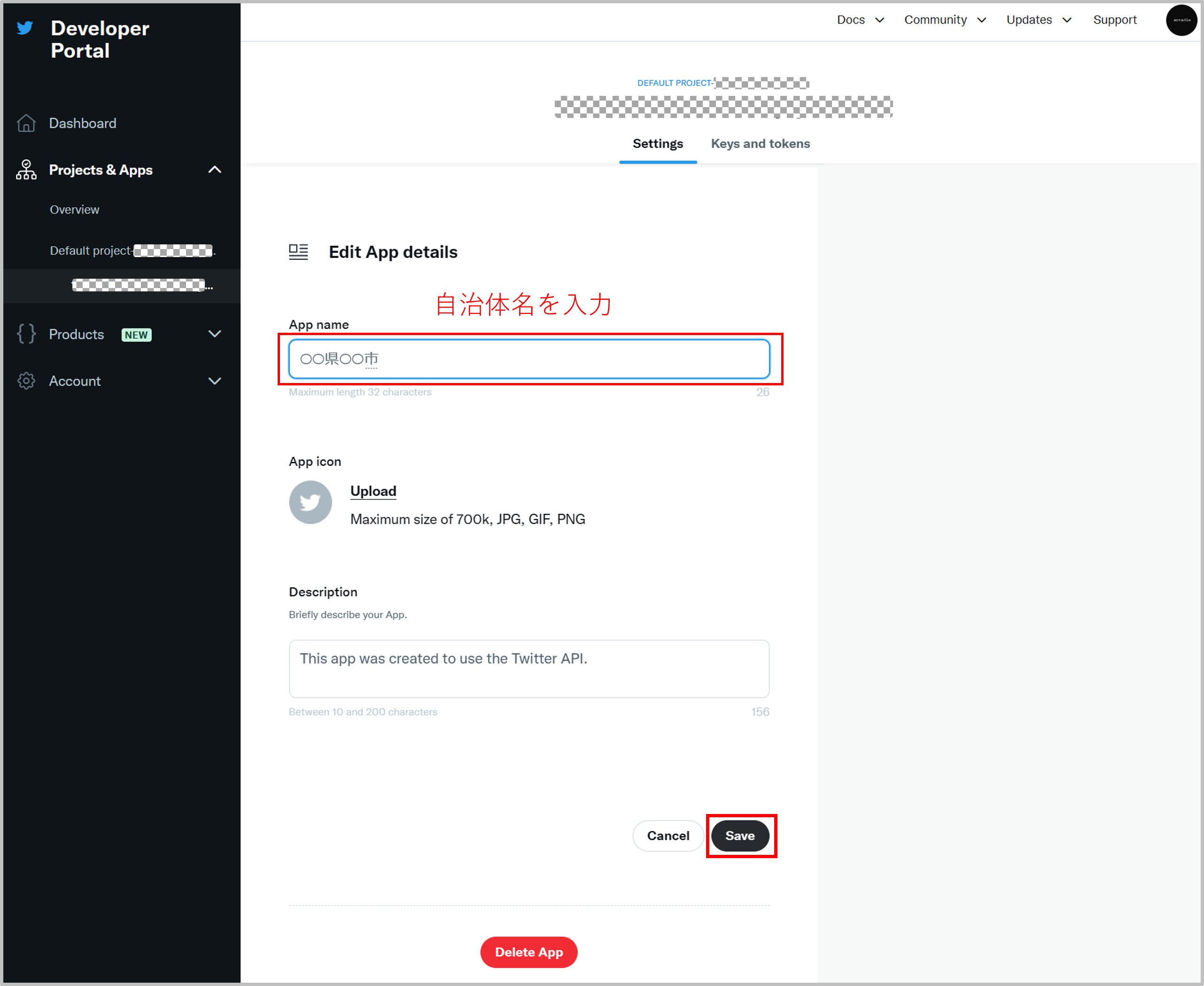2,”App name” を自治体名に変更し、「Save」をクリック